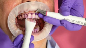 Airflow (profilaxie cu pulbere fină) – curățare delicată și lustruire cu jet de aer, apă și particule de glicină sau bicarbonat